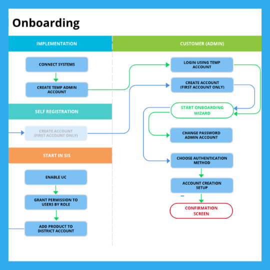 I designed a guided setup workflow with three entry paths to accommodate different installation scenarios: implementation technicians could create the account, customers could self-register, or customers could start the process from within the SIS.