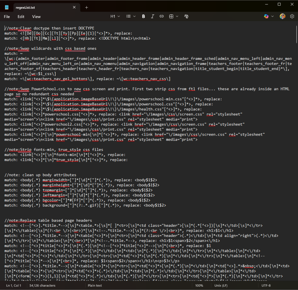I wrote multiple complex regular expressions that would read every page on the server and rewrite them using standard page templates. By the end of the project I could migrate the entire front end (6,000 pages) in minutes. There were a handful of outliers (only 5% of the pages) which needed hand coding, but largely the site was fully migrated.