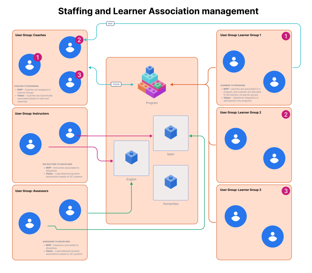 Beyond iterating on individual designs, we made strategic decisions about system architecture. One example: how to model associations between students and staff. I identified both an ideal approach and a simpler, faster one. For the first iteration, our priority was standing the system up and proving it worked, so we chose the expedient path. It was less robust, but it solved the core problem and got us to validation faster.