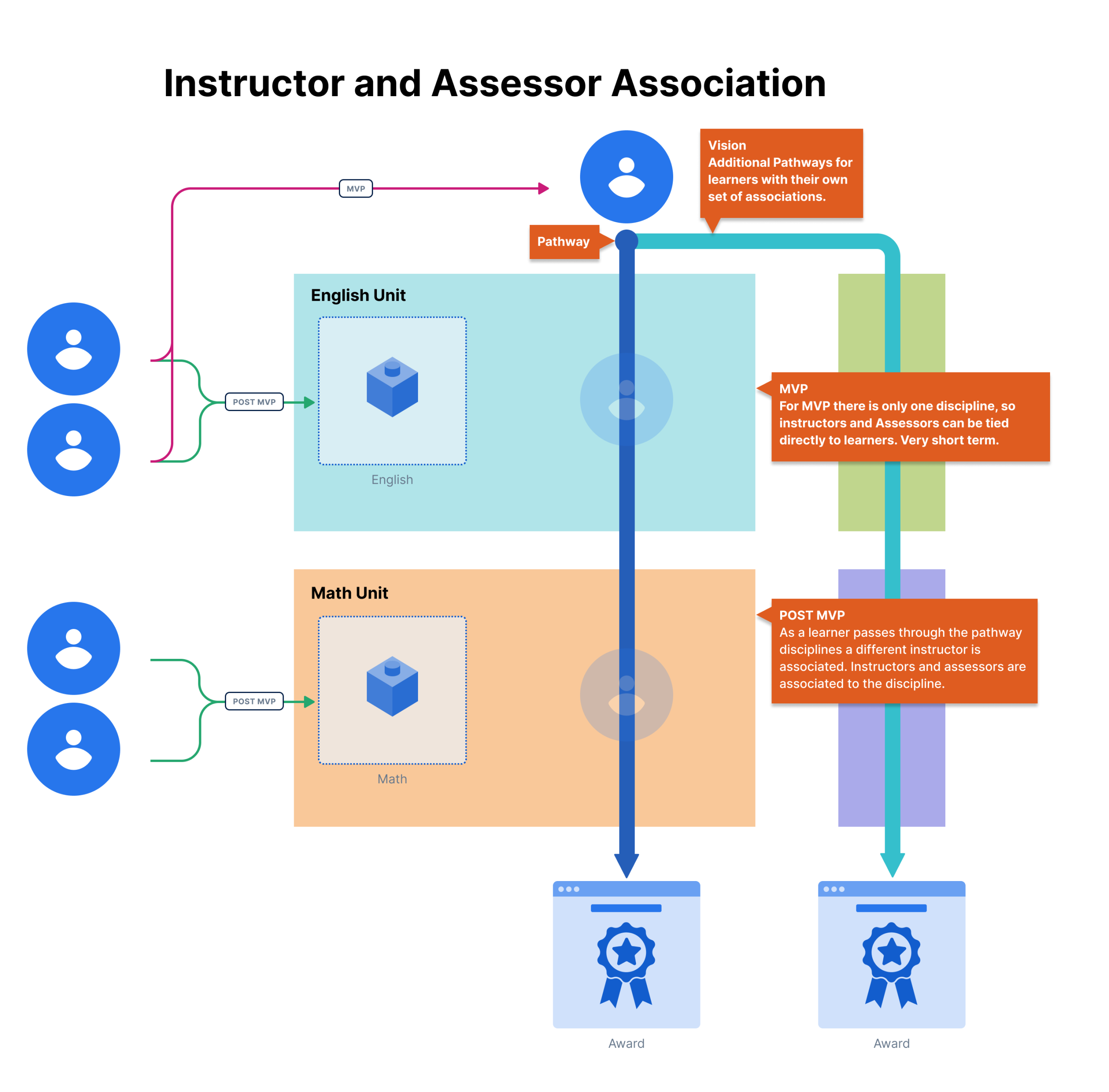 As students complete their learning pathway, different courses belong to different disciplines, and each discipline has a different instructor. The expedient choice left the system inflexible to those real-world associations. Documenting that tradeoff explicitly, and designing the ideal model alongside it, meant the engineering team knew exactly what to build next when resources allowed.
